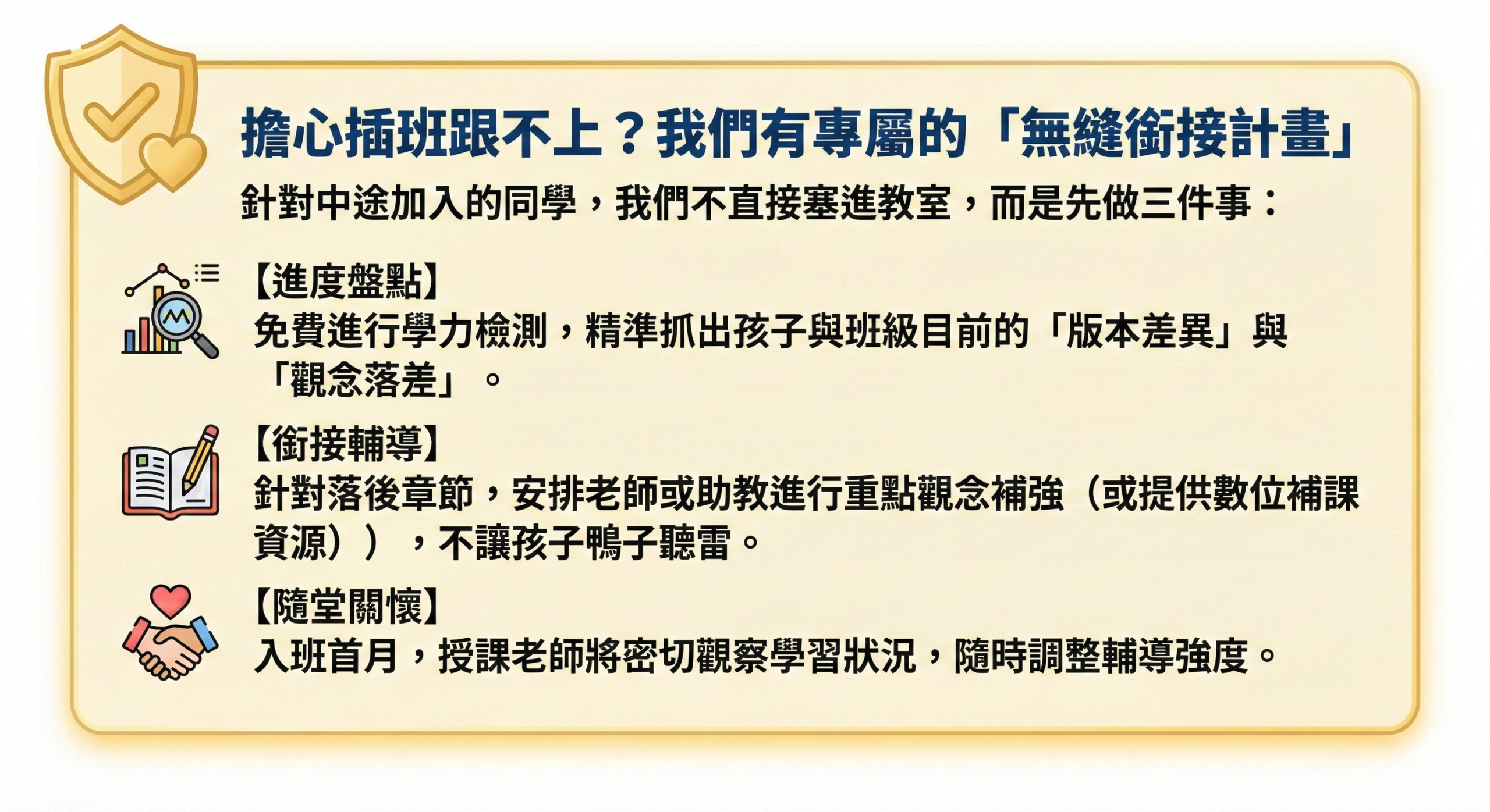• 別讓進度落差成為轉班的阻礙,現在就是最好的停損點