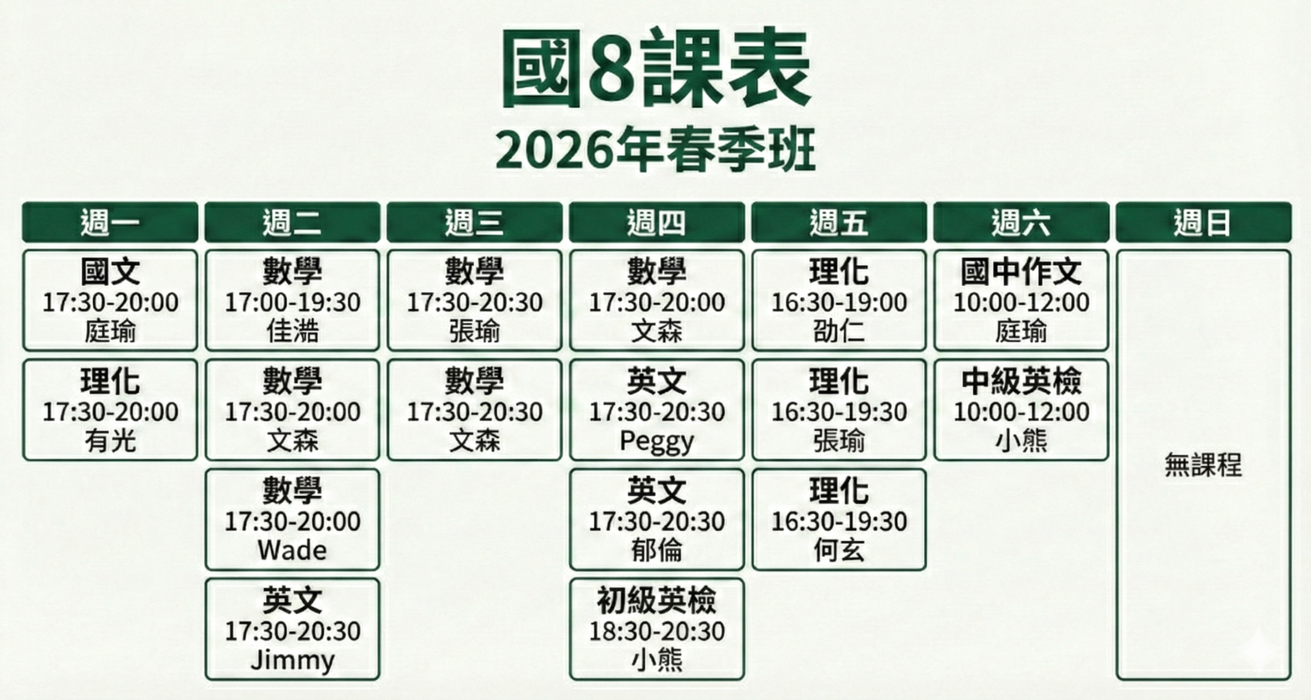 • 英文團體班A|週二17:30-20:30|Jimmy|針對翰林進度